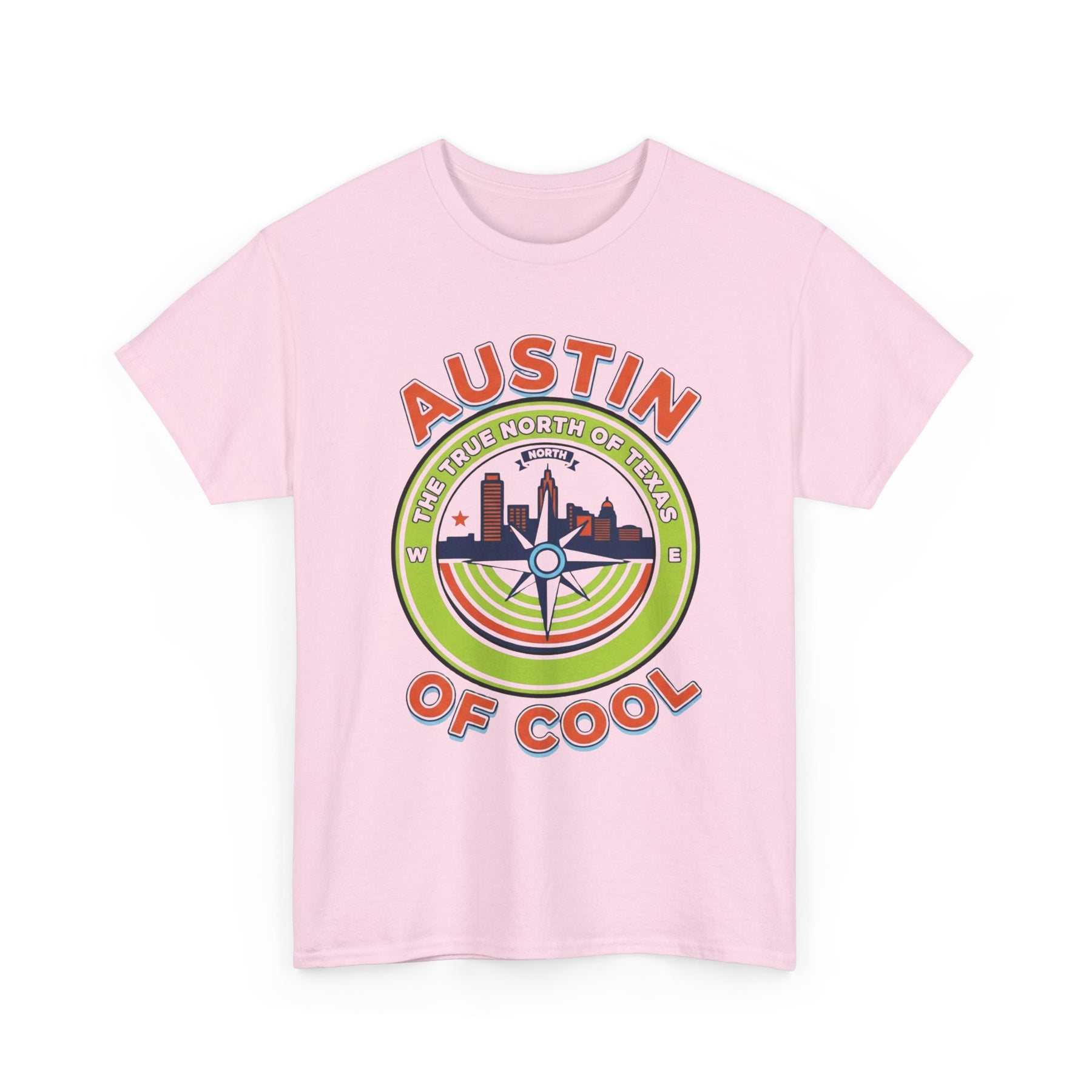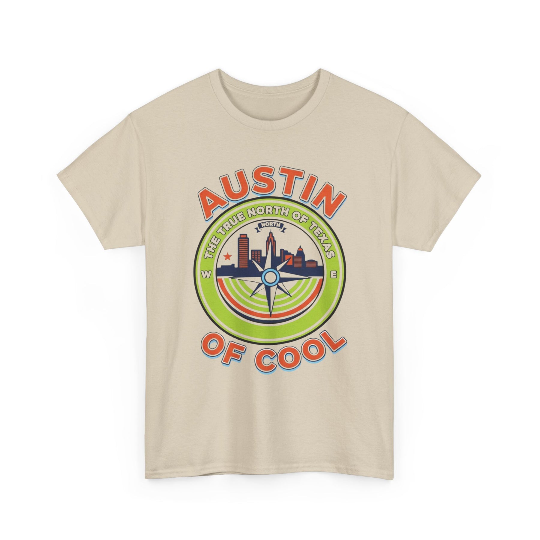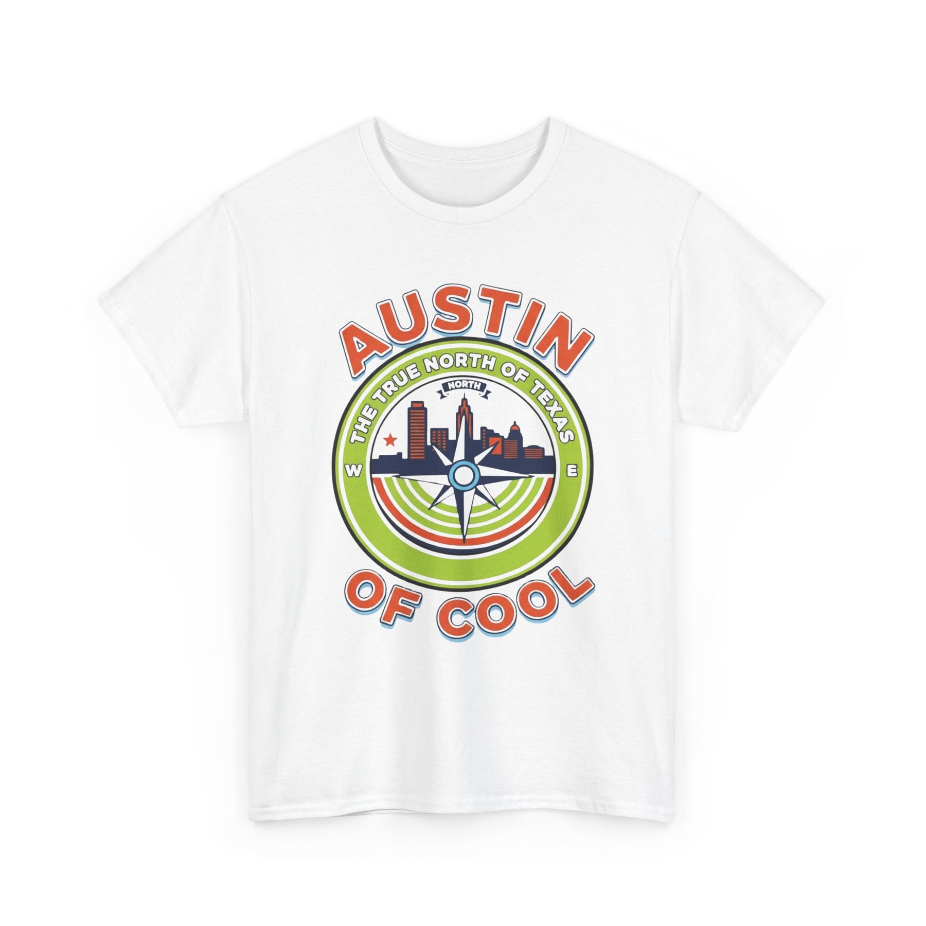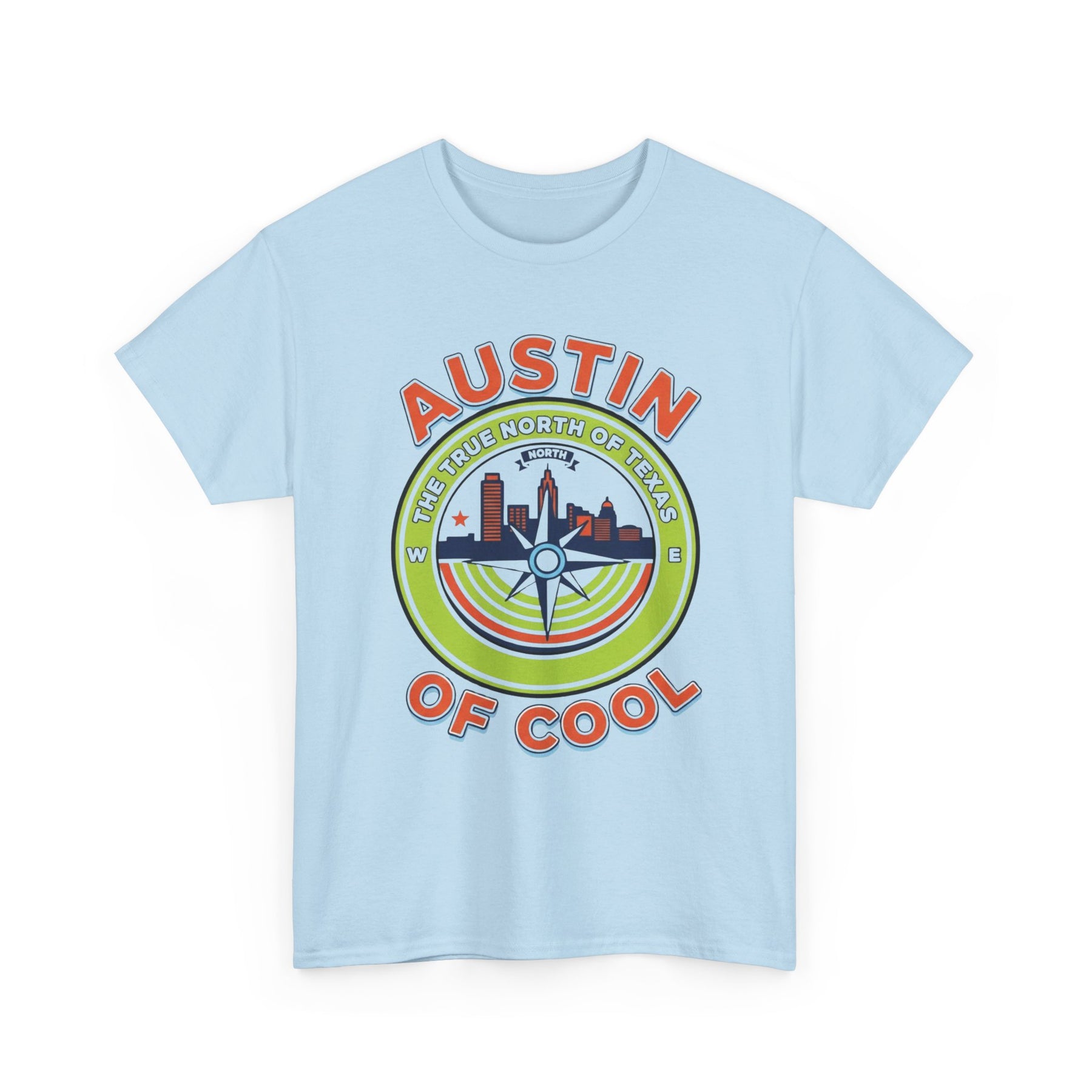 • Unisex heavy cotton T-shirt • Austin skyline with compass-themed design • Comfortable and durable casual fit • Bright, colorful shirt graphic • Great gift for Austin locals, tourists, and Texas fans