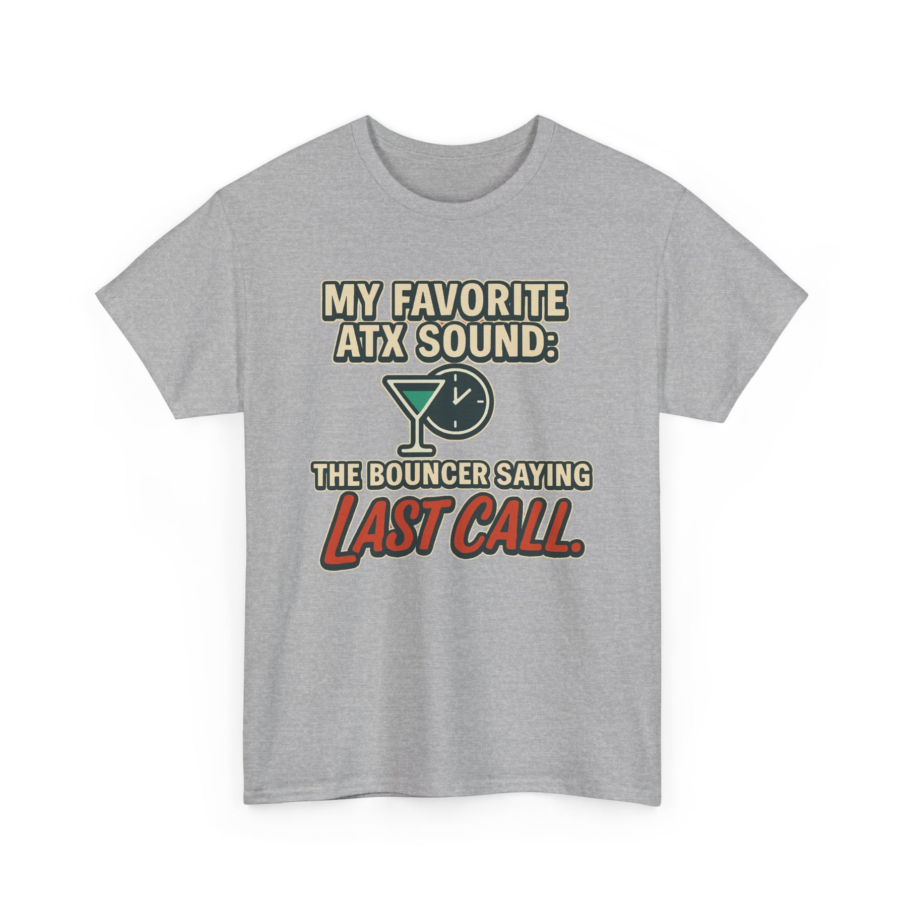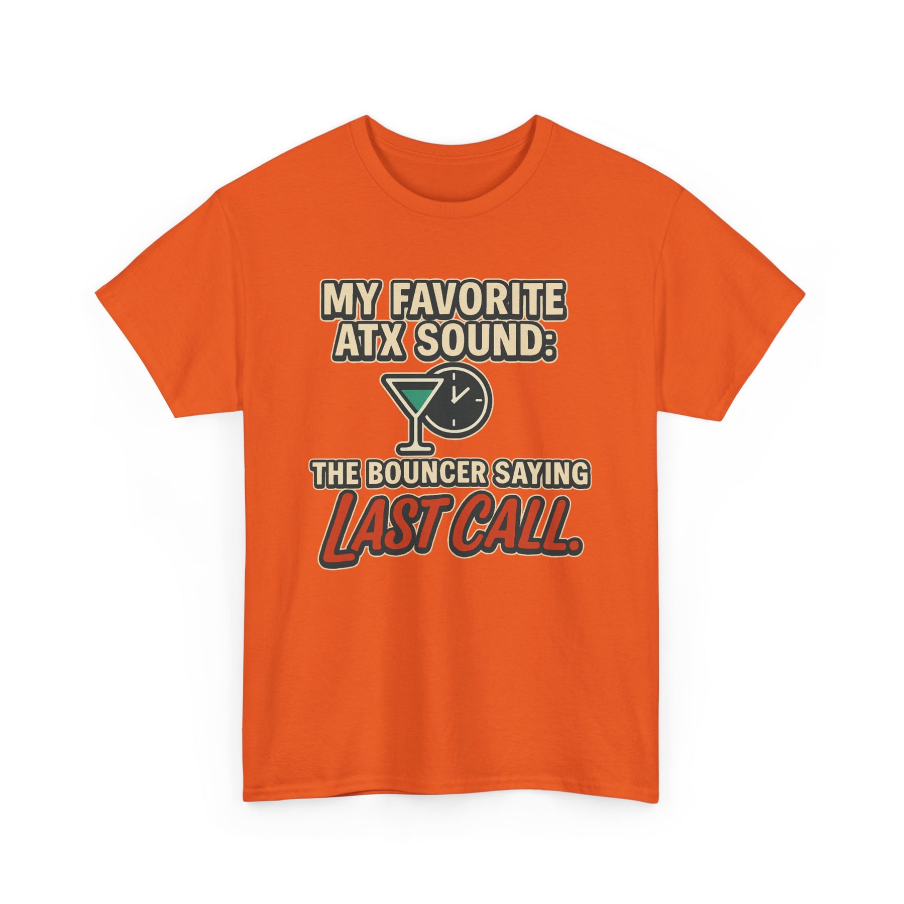 Celebrate Austin’s nightlife with this bold "MY FAVORITE ATX SOUND: THE BOUNCER SAYING LAST CALL" graphic tee. Perfect for 6th Street bar crawls, nights out, or just showing off your ATX pride, this unisex shirt combines comfort and humor in one. The bright orange color and standout design make it a favorite for both locals and visitors.