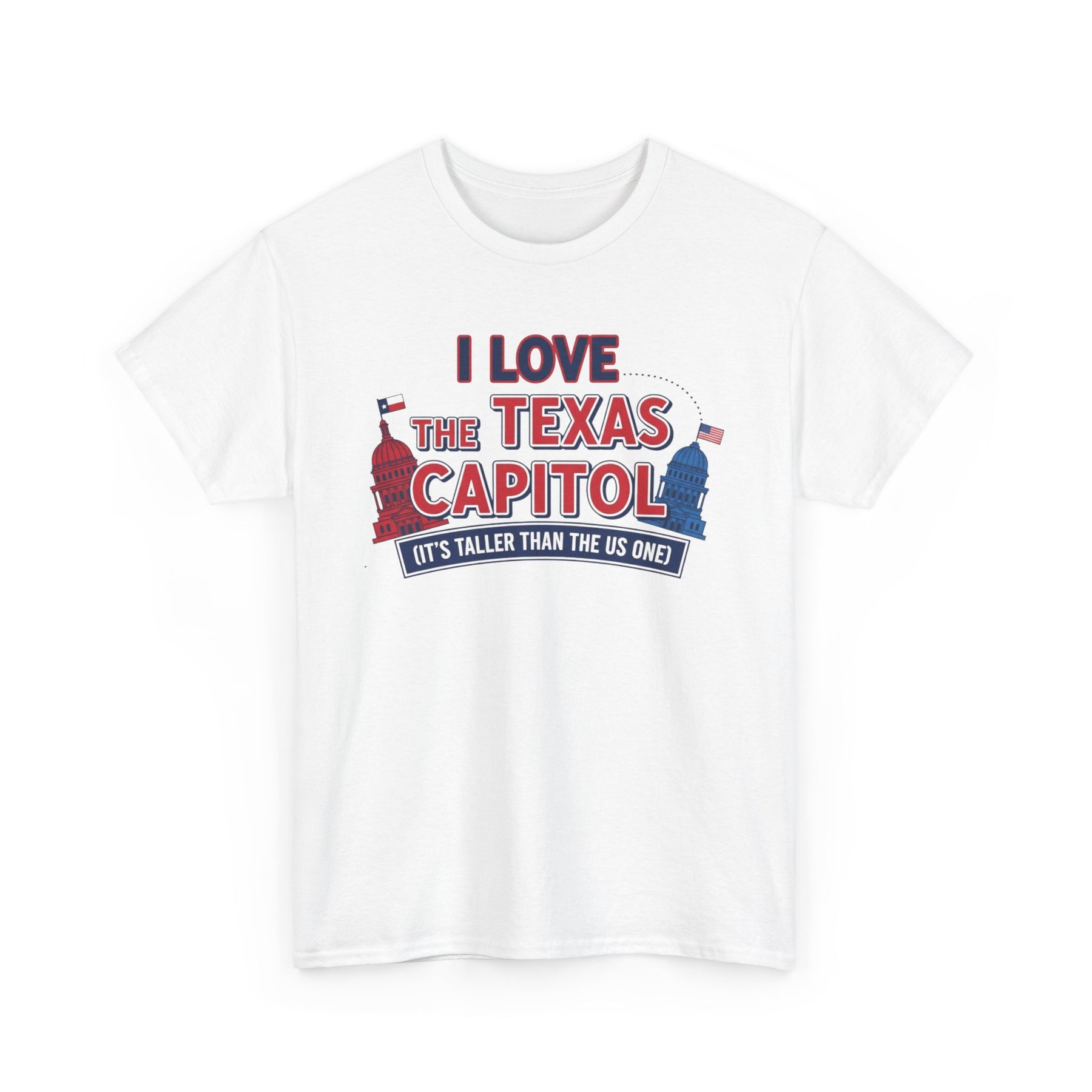 Celebrate Texas pride with this bold "I LOVE THE TEXAS CAPITOL (IT’S TALLER THAN THE US ONE)" graphic tee. Perfect for Austin visits, Texas-themed events, or showing off your Lone Star spirit, this unisex shirt blends comfort with local pride. The heather gray color and standout red, white, and blue design make it a favorite for both locals and visitors. • Unisex heavy cotton T-shirt • Texas Capitol graphic design • Comfortable and durable casual fit • Heather gray shirt with bold print • Great gift for Texans, tourists, and Austin lovers